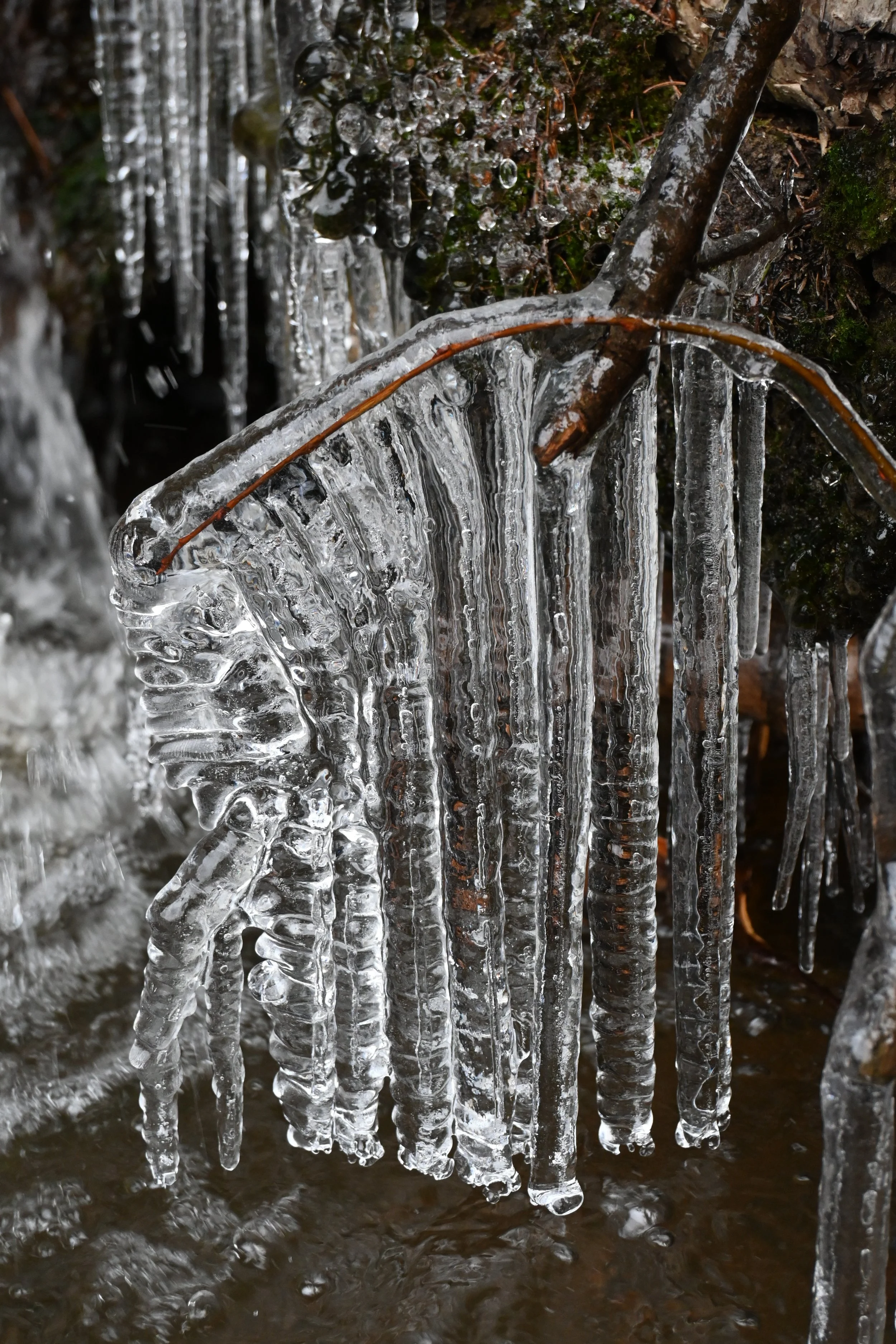 Talvisen joen töyrään oksan haaraan on valuvasta vedestä muodostunut jääpuikkojen rivistö, jossa päivänvalo tuo esiin puikkojen vaihtelevat muodot. Sommittelu on hyvin