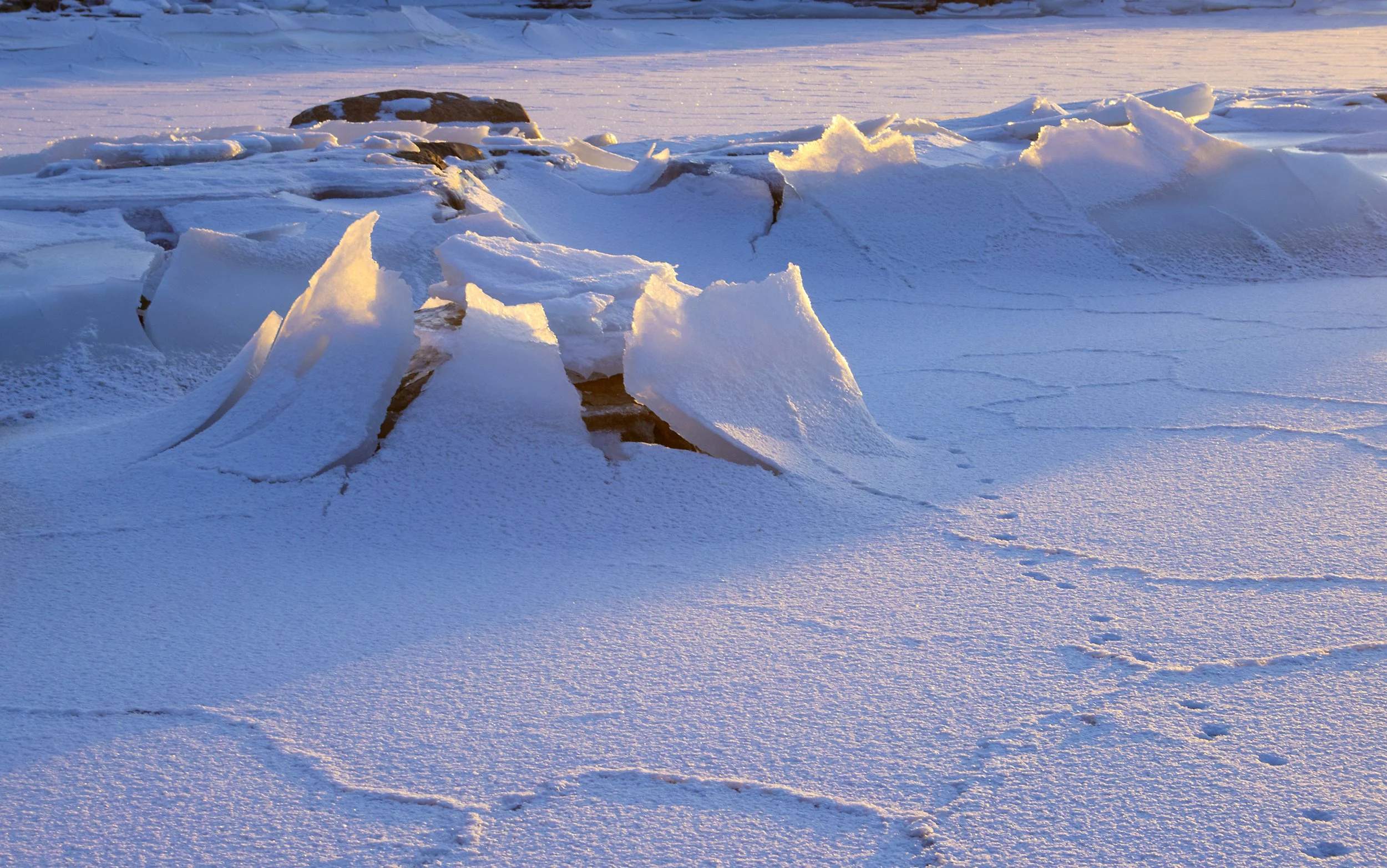 Talvipäivän matalalta paistava valo viistää jään pintaa värjäten valokohdat vaalean punaisiksi ja varjokohdat sinisiksi. Kivien päälle työntyvä jää on halkeillut useaan osaan.