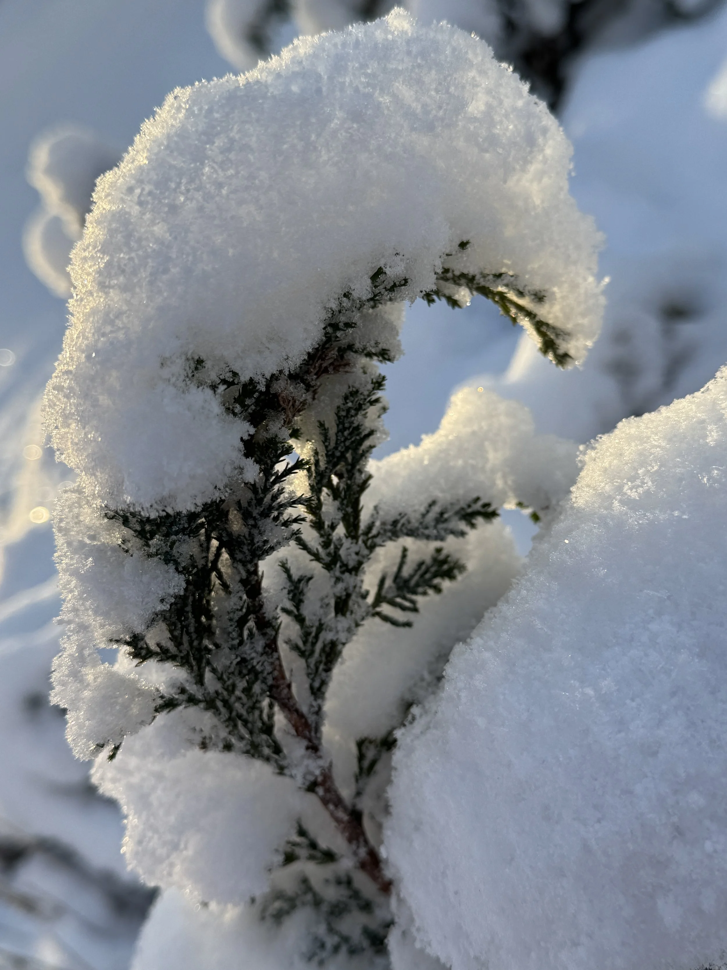 muotokuvatilaa. Tässä kuvassa tausta häiritsee muuten hienoa sommittelua. Vastavalo värjää katajan lumiharjanteen keltaiseksi näyttäen samalla lumen rakenteen yksityiskohtia.
