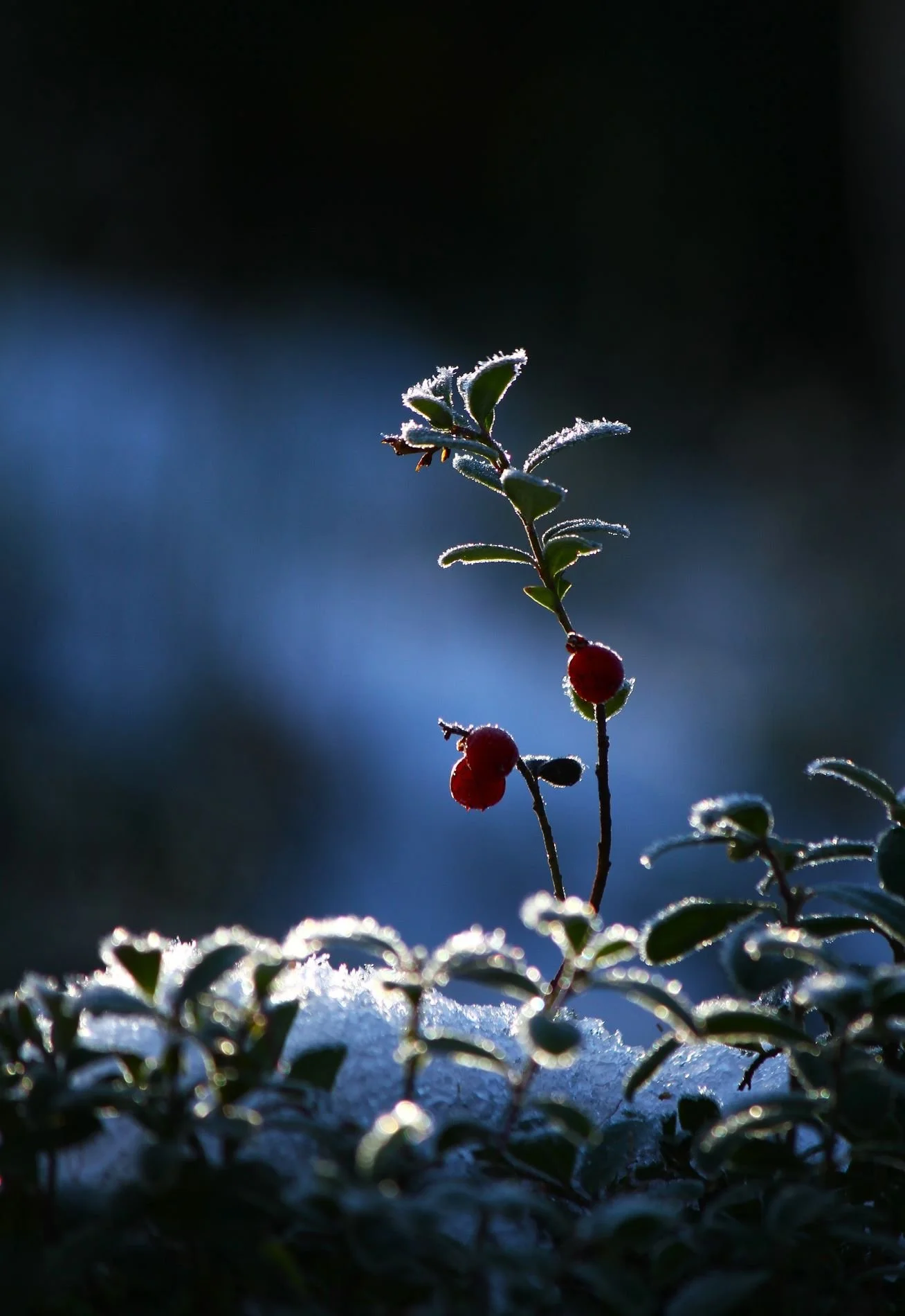 Vastavalo tuo hyvin esiin kuuran puolukan marjoilla ja lehdillä. Lumen yläosaan kohdistuva lämmin valo saa sen näyttämään alaosaltaan hyytävän kylmältä. Taustan kylmä sinerrys lisää vielä lisää kylmän tuntua. Vastavärit vihreä ja punainen korostavat myös toisiaan.