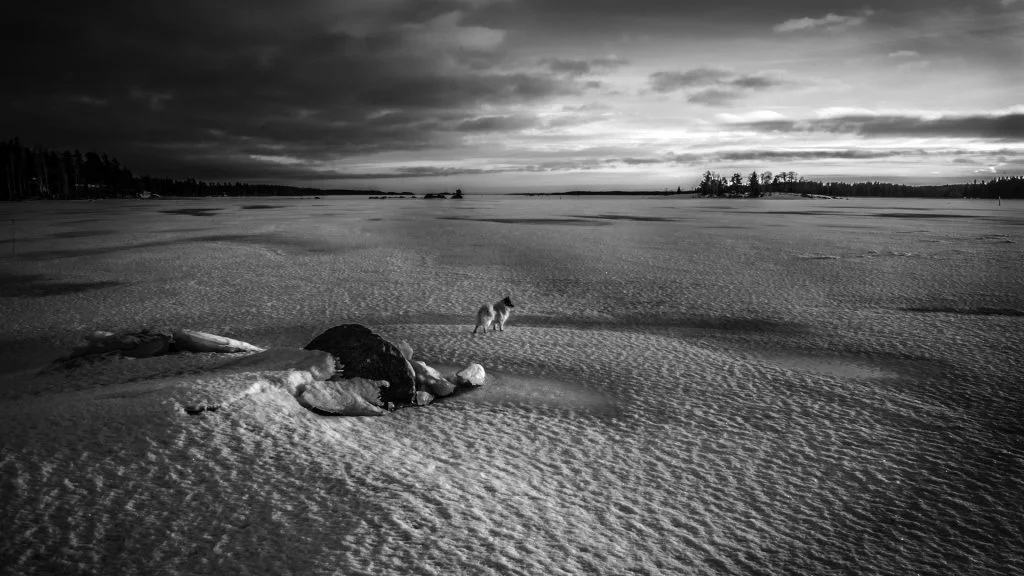 Fin landskapsbild som gör sig mycket bra i svartvitt. S/V gör bilden litet dramatisk - märk att dramatiken avtar om man beskär bilden på vänstra kanten. Helheten är dock lugn och harmonisk. Fina former på snön på isen - vinterns släpljus framhäver dem på ett mycket lyckat sätt. Många detaljer också i denna bild att upptäcka och begrunda. Hunden är bra placerad i mitten och jag tycker om att hunden är vänd mot ljuset och blickar åt samma håll som betraktarens blick dras mot.